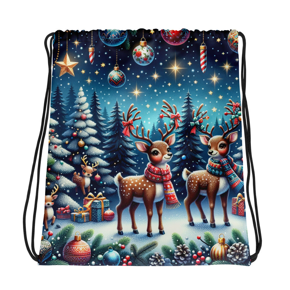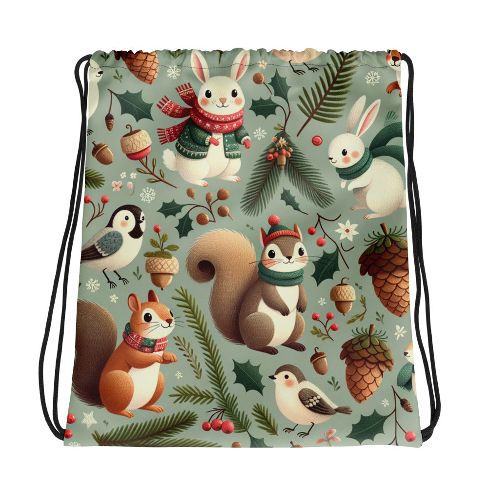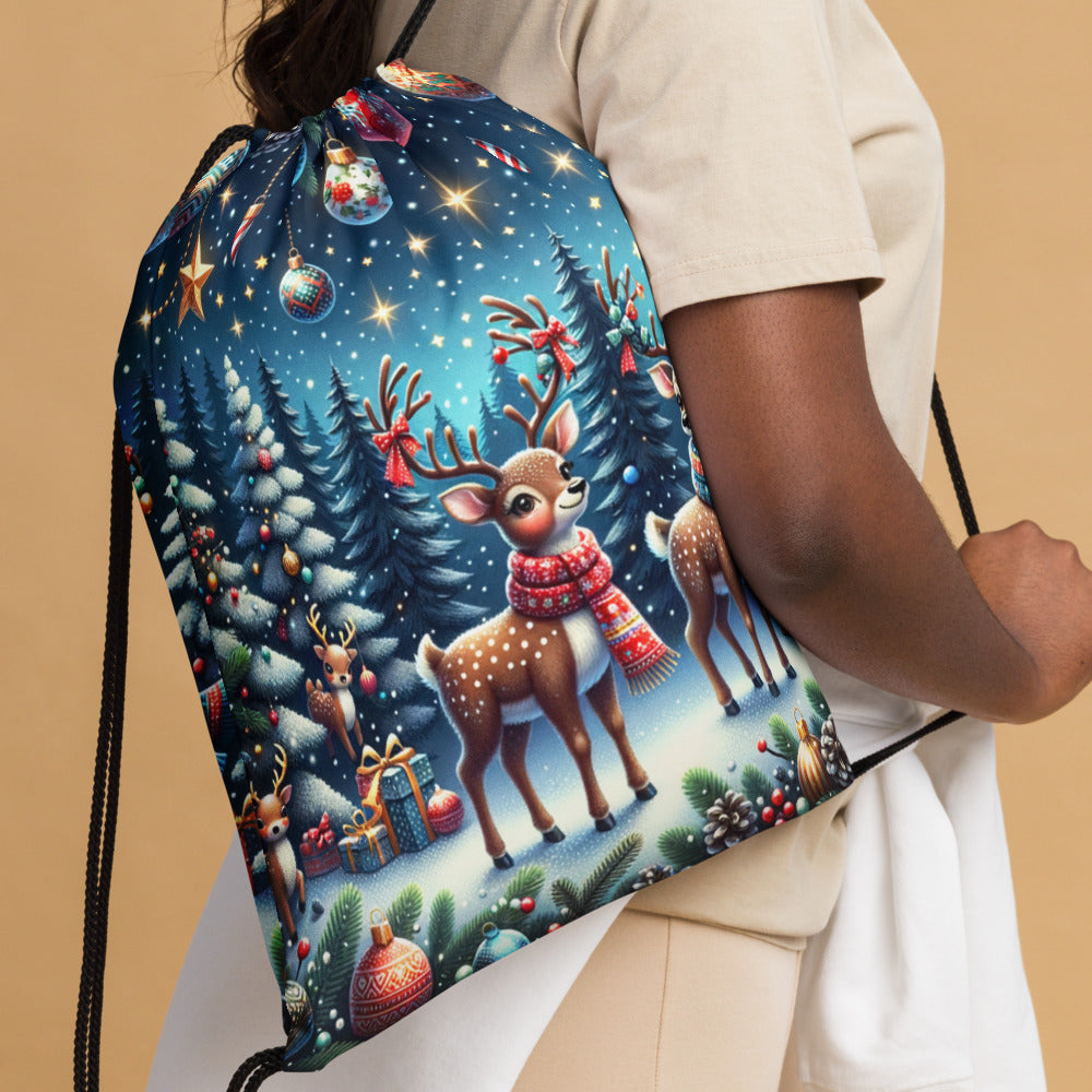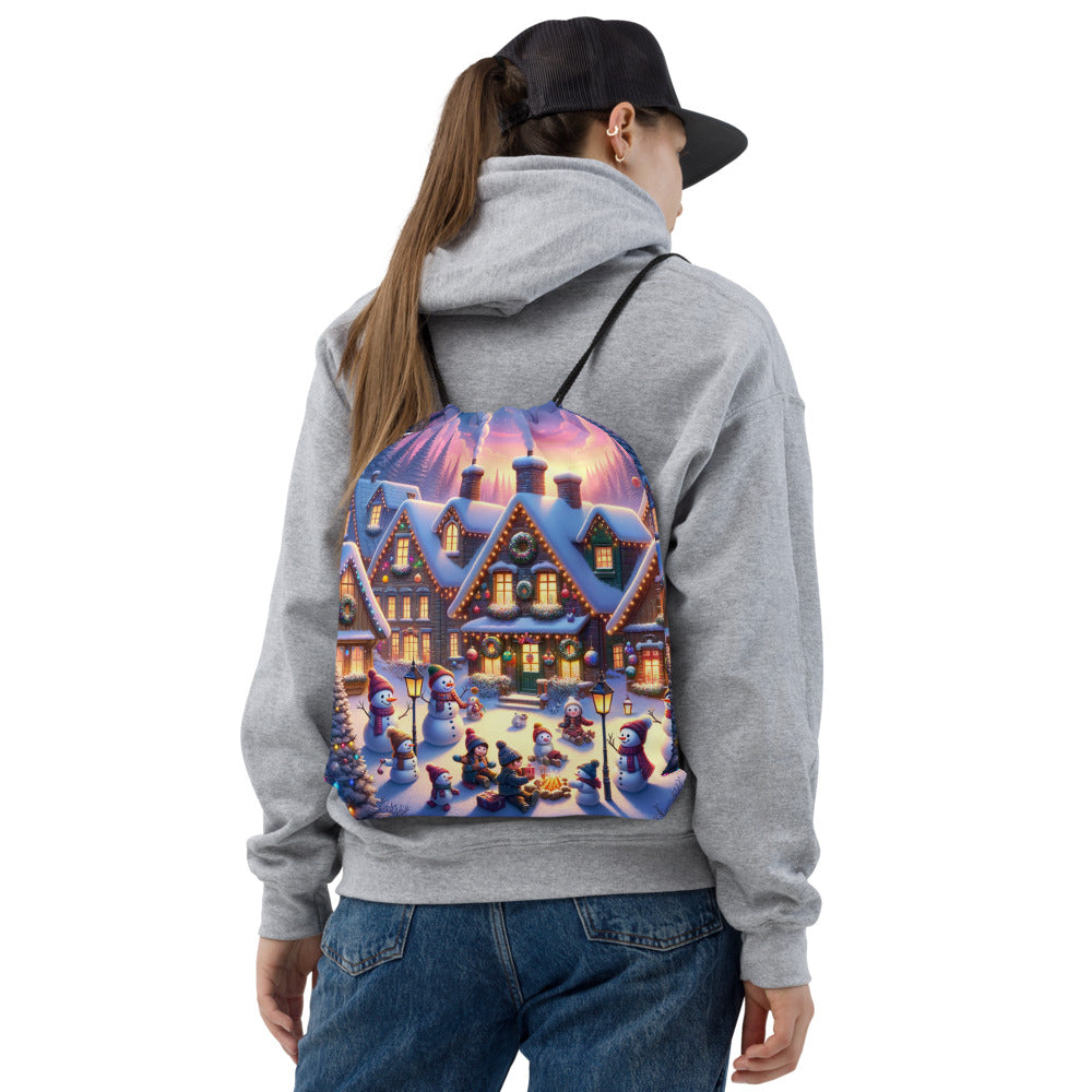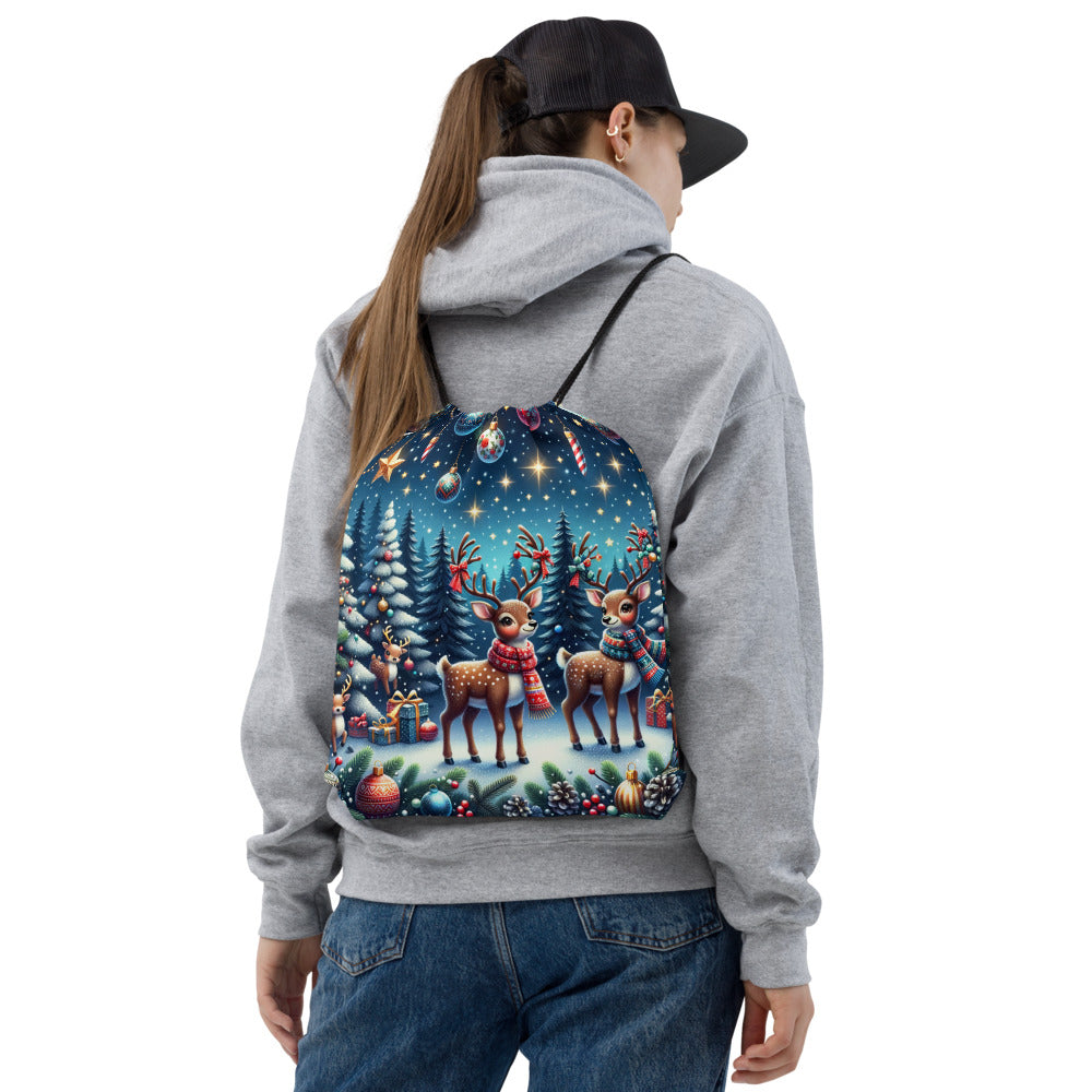 Embrace the festive spirit with our Whimsical Winter Wear collection and bring a touch of holiday cheer to your daily routine. Our Christmas drawstring bag seamlessly blends vibrant prints with a sporty style, making it a standout gym essential. Wear it comfortably as a backpack, featuring a practical drawstring closure at the top and slim, contrasting shoulder straps.