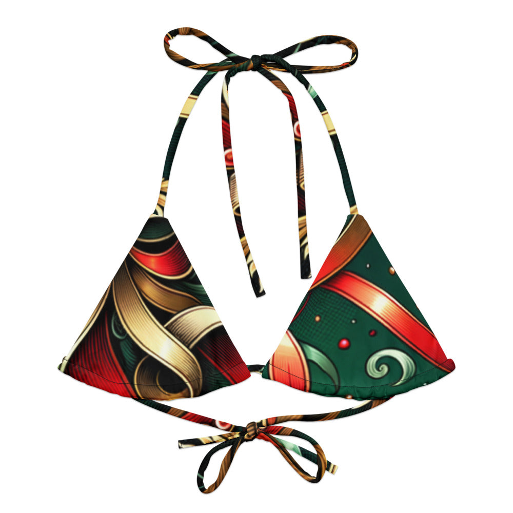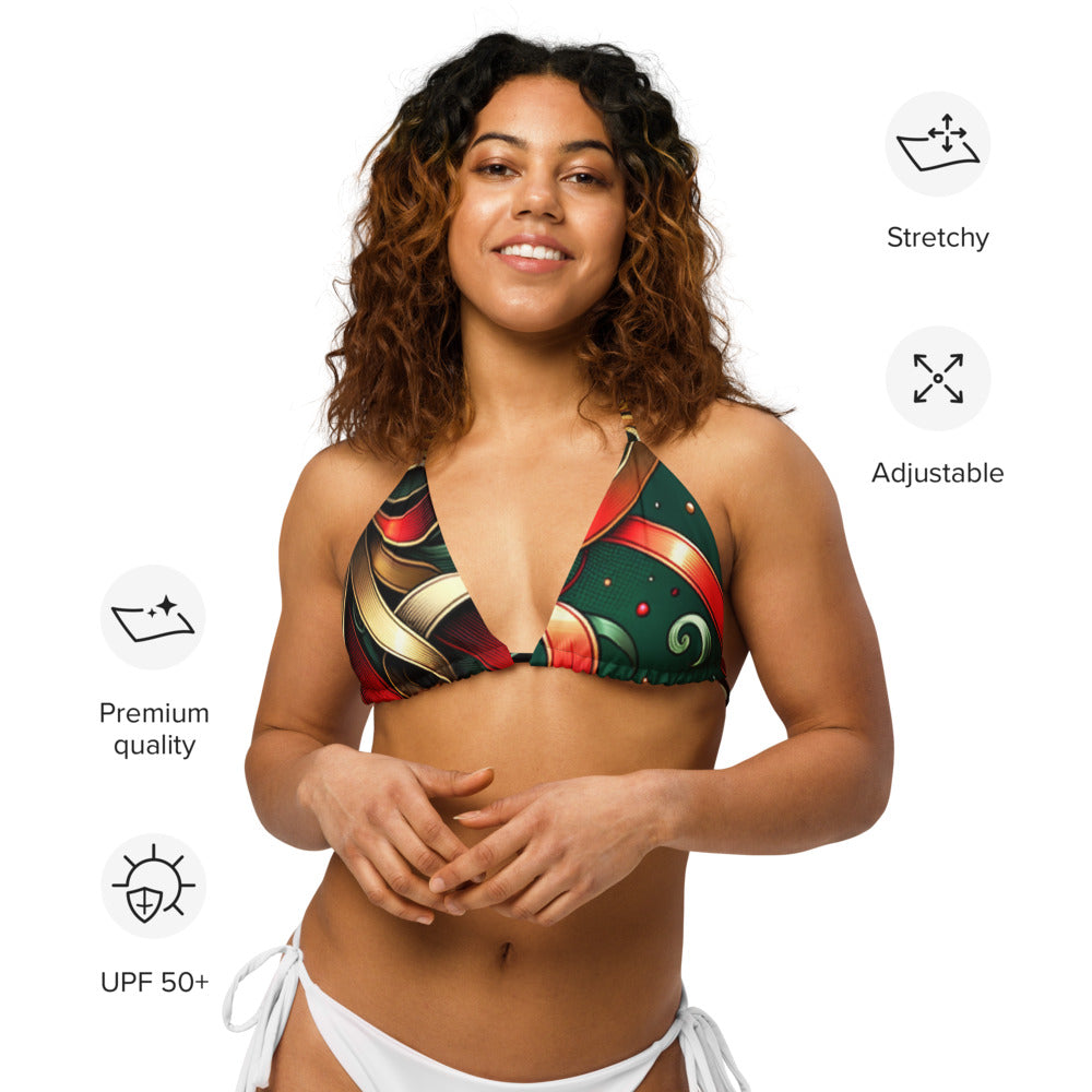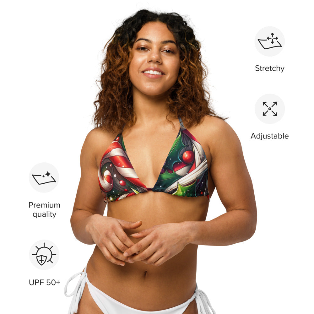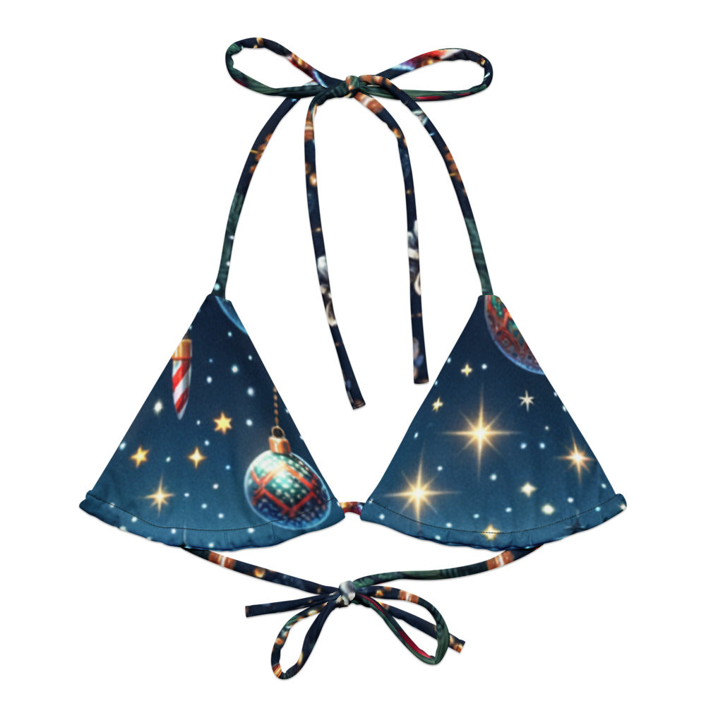 Celebrate the Christmas season with Whimsical Winter Wear's eco-friendly Recycled Padded String Bikini Top. Crafted with care from soft recycled polyester, this bikini top not only offers a sustainable choice but ensures sun protection with UPF 50+. Its adaptable, stretchy straps allow for versatile styling, making it a must-have for your holiday swim collection. Don’t wait, pair it with your favorite swimwear ensemble today!