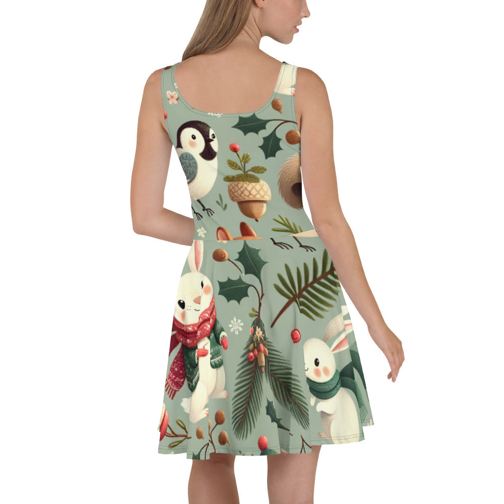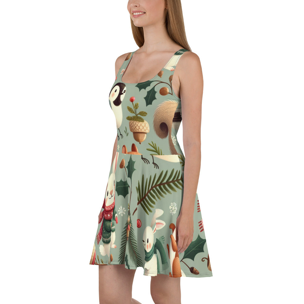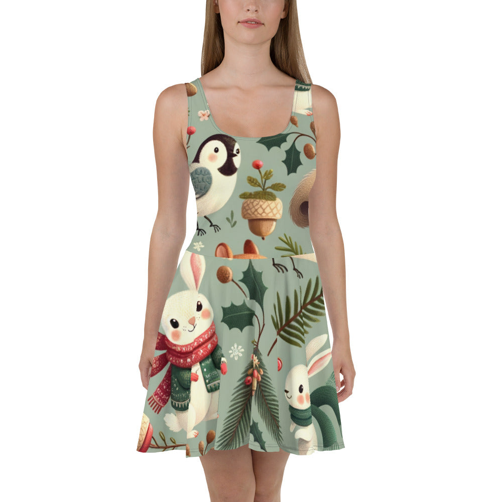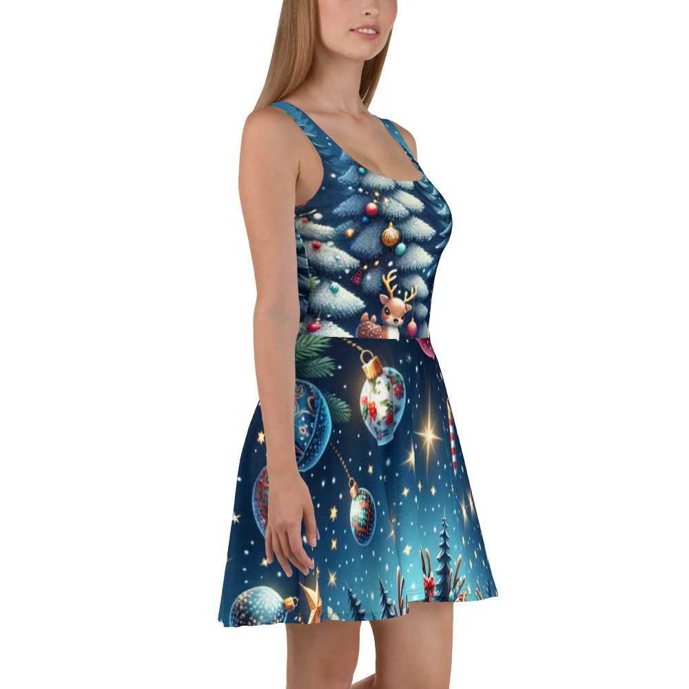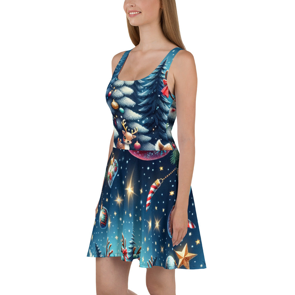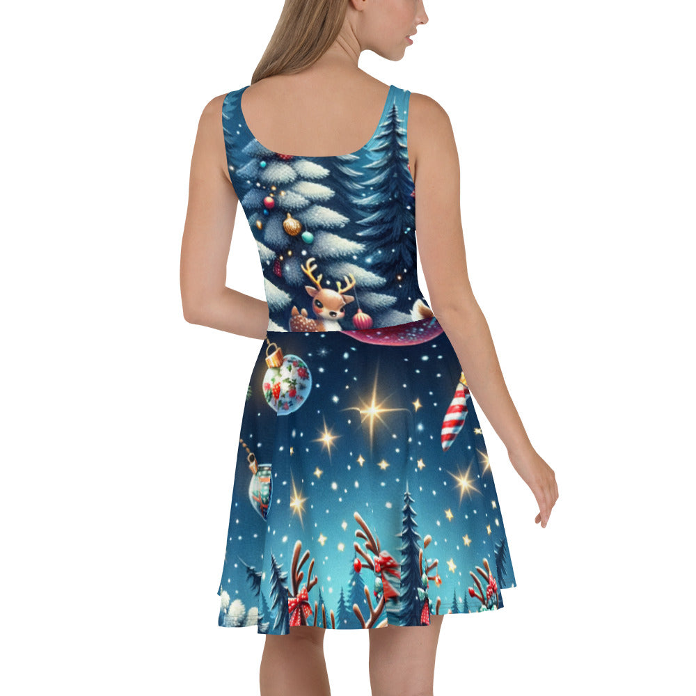 Immerse yourself in the festive spirit with our enchanting Whimsical Winter Wear collection. Designed specially for Christmas celebrations, this sleeveless skater dress ensures you dress to impress with its elegant charm. The soft, smooth fabric paired with a flared skirt creates a vibrant and sophisticated look that highlights its exquisite design.
